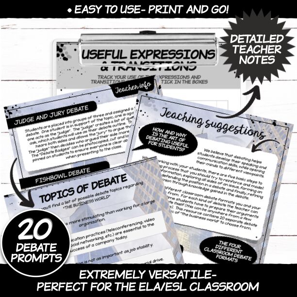 - 3 pages of useful expressions and transitions for debating (Encouraging students to use and record a variety of useful expressions and transitional phrases to create an effective debate)